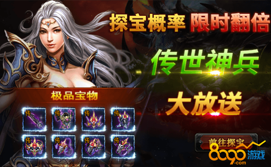 活动期间内,探宝概率翻倍;并有较大概率获得传世神装、高转装备、霸王神装、等极品道具!