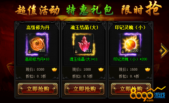 活动期间,可购买超优折扣每日限购礼包,高级修为丹、印记灵魄、探宝符、羽毛、魂玉结晶、护盾结晶、暗器结晶、成就令牌、声望令牌等极品道具仅限活动期间跳楼优惠!