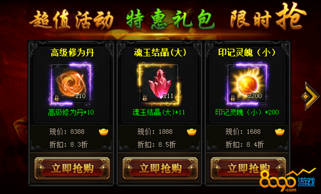 活动期间,可购买超优折扣每日限购礼包,高级修为丹、印记灵魄、探宝符、羽毛、魂玉结晶、护盾结晶、暗器结晶、成就令牌、声望令牌等极品道具仅限活动期间跳楼优惠!