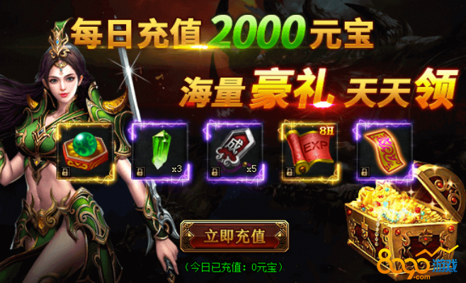 活动期间内,每天充值2000元宝可以领取1000W经验,暗器结晶,成就令牌,探宝符、8小时三倍经验符等海量道具!