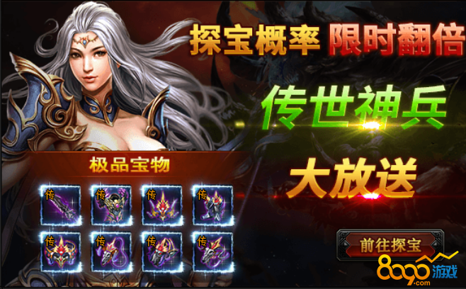活动期间内,探宝概率翻倍;并有较大概率获得传世神装、高转装备、霸王神装、等极品道具!