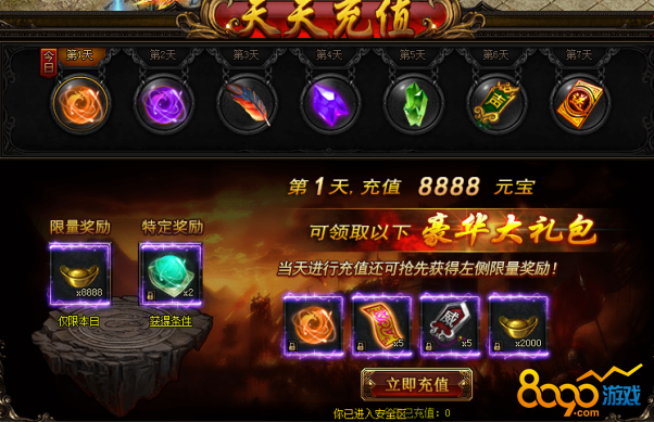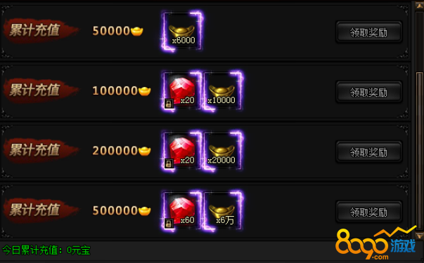 活动期间,每日累计充值指定金额元宝即可获得奖励!