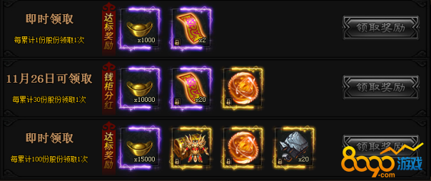 活动期间,每充值8888元宝即可获得1份股份,最高持有200股份。达到指定要求股份数量和时间要求,即可领取奖励。(温馨提示,传世宝箱等你来拿)