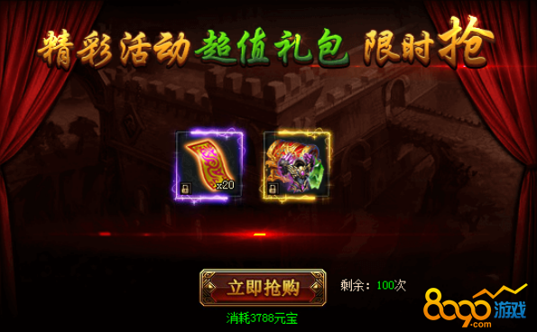 活动期间,可购买超优折扣每日限购礼包,英雄转职卡、印记灵魄、探宝符、羽毛、魂玉结晶、护盾结晶、暗器结晶、成就令牌、声望令牌等极品道具仅限活动期间跳楼优惠!