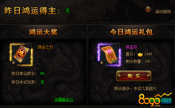 活动期间,购买限购礼包赢取幸运大奖,奖励极品限时称号。(全服限量买到即赚到)购买礼包越多,中奖几率越大!