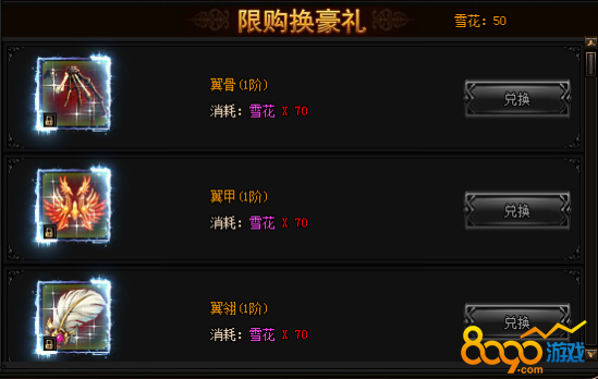 活动期间内,进行幸运探宝有一定概率获得雪花。可以使用雪花兑换下列极品奖励!