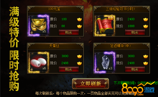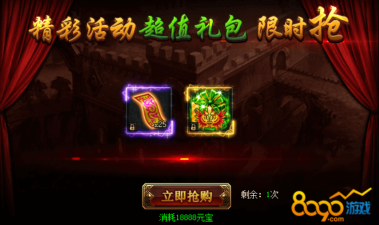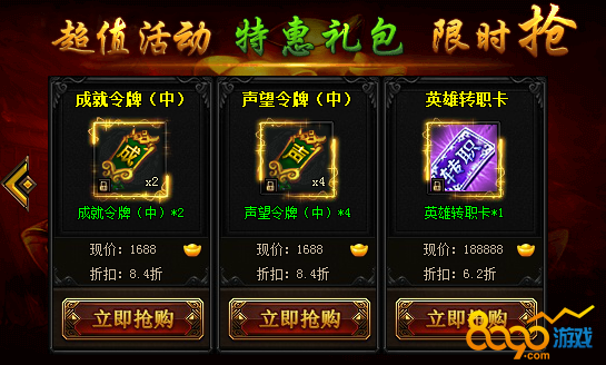 活动期间,可购买超优折扣每日限购礼包,英雄转职卡、印记灵魄、探宝符、羽毛、魂玉结晶、护盾结晶、暗器结晶、成就令牌、声望令牌等极品道具仅限活动期间跳楼优惠!