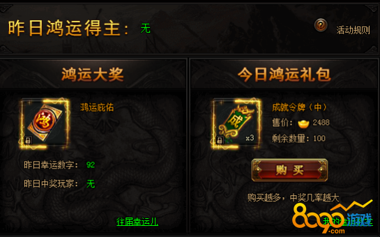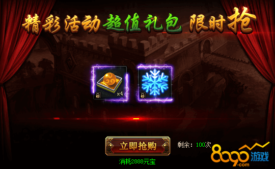 活动期间,购买限购礼包赢取幸运大奖,奖励极品限时称号。(全服限量买到即赚到)购买礼包越多,中奖几率越大!