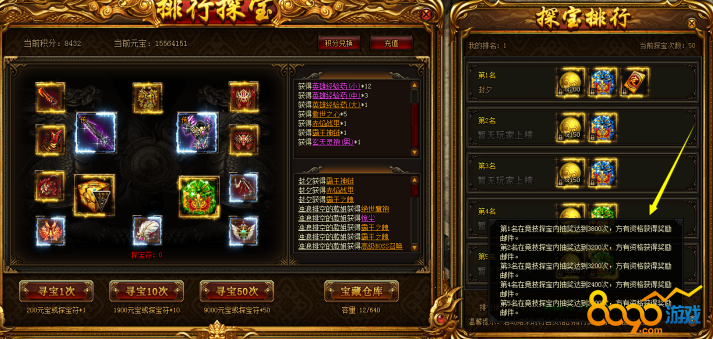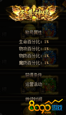 活动期间,排行榜前5名玩家可获得精美道具奖励,排行榜第1名,可获得奖励特殊定制称号“至尊神壕”!(注:需要足够的探宝次数才能获得对应的排名奖励!)
