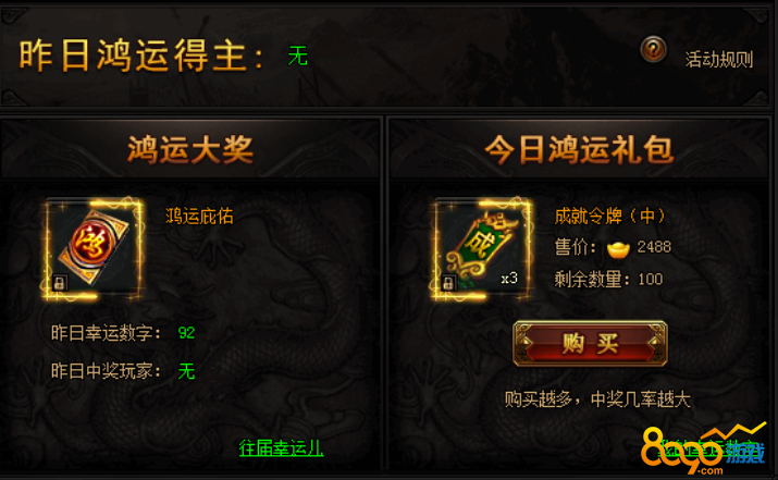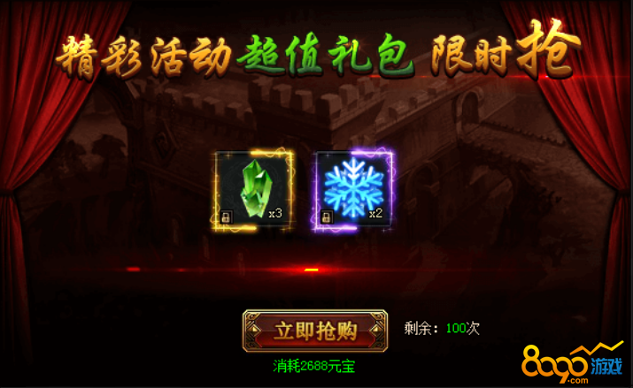 活动期间,购买限购礼包赢取幸运大奖,奖励极品限时称号。(全服限量买到即赚到)购买礼包越多,中奖几率越大!