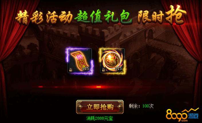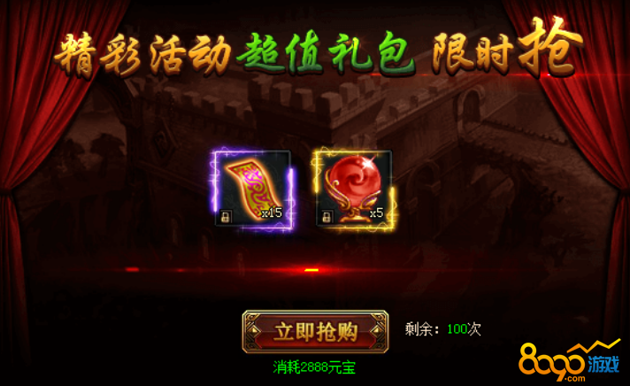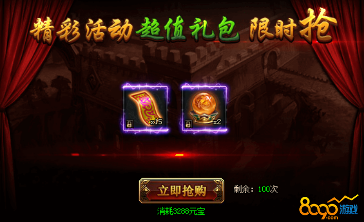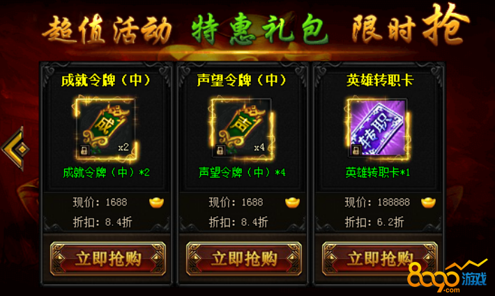 活动期间,可购买超优折扣每日限购礼包,英雄转职卡、印记灵魄、探宝符、羽毛、魂玉结晶、护盾结晶、暗器结晶、成就令牌、声望令牌等极品道具仅限活动期间跳楼优惠!