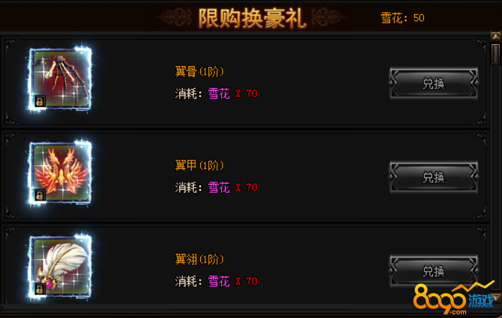 活动期间内,进行幸运探宝有一定概率获得雪花。可以使用雪花兑换下列极品奖励!