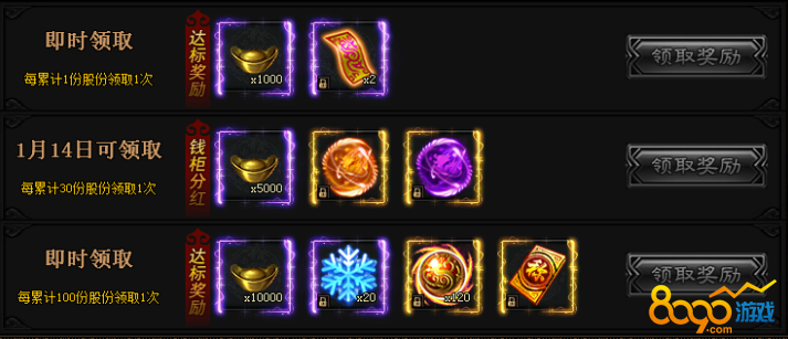 活动期间,每充值8888元宝即可获得一份股份,最高可持有100股份。达到指定股份数量和时间要求即可领取奖励!