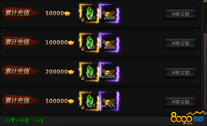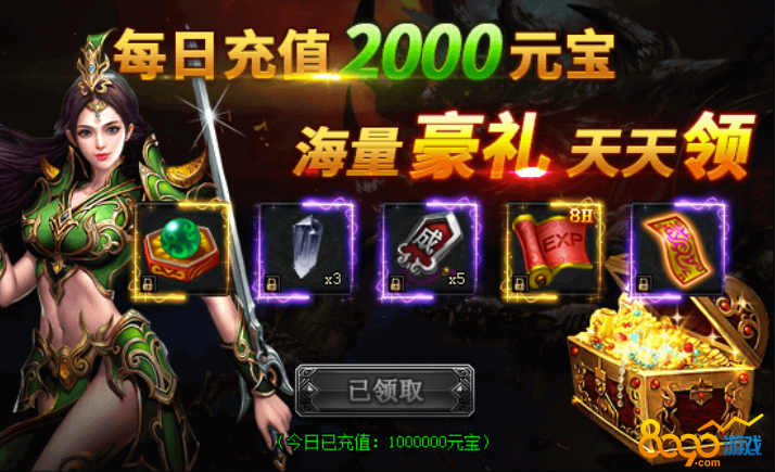 活动期间内,每天充值2000元宝可以领取1000W经验,足迹结晶,成就令牌,探宝符、8小时三倍经验符等海量道具!