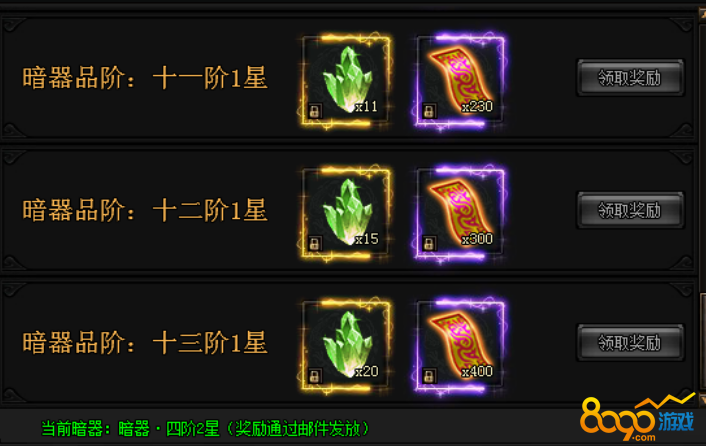 活动期间,暗器达到指定要求,即可领取大奖。每项奖励每人仅限领取一次。