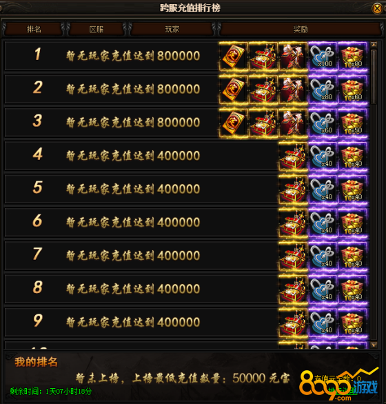 活动开启期间,玩家充值提前元宝数达到特定元宝即可登上平台充值排行榜对应位置,具体元宝数已展示在活动界面上;充值越多排名越靠前,提取数相同时按照时间顺序排列,活动结束时登上排行榜的玩家可获得精美道具。活动会在最后一日23:59:00秒开始统计结算,请玩家勿在最后一分钟充值,有可能不统计。(注:因数据量较大,排行榜刷新和奖励发放可能会约有10分钟的延迟,请大家谅解。)