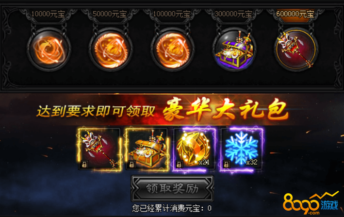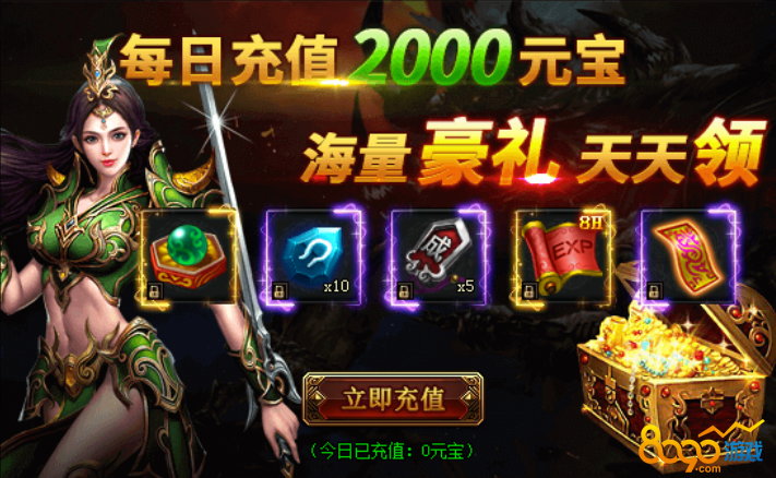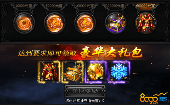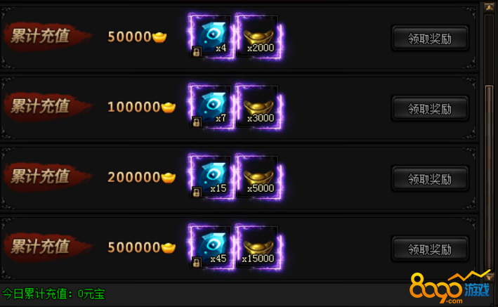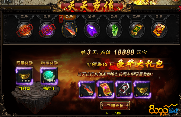 活动期间,每日累计充值指定数额元宝即可领取奖励!