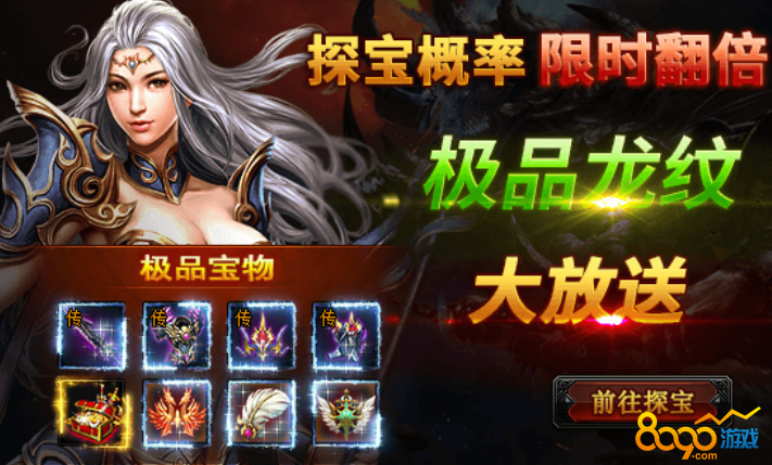 活动期间,探宝概率翻倍,并有较大概率获得高转装备、霸王神装等珍稀道具。