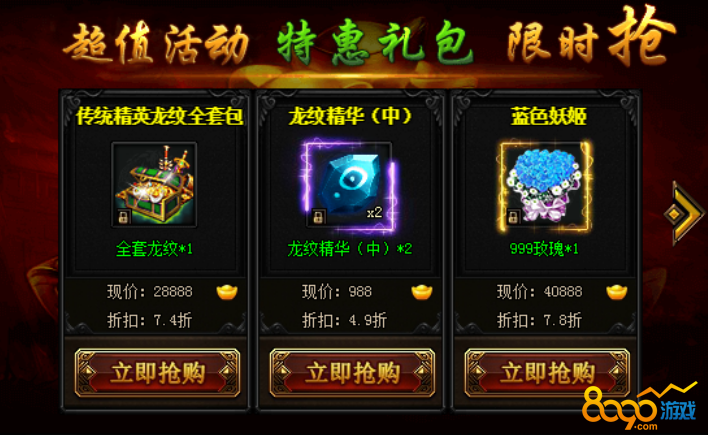 活动期间,可购买超优折扣每日限购礼包,传统精英龙纹全套包、蓝色妖姬、印记灵魄、探宝符、羽毛、魂玉结晶、护盾结晶、暗器结晶、成就令牌、声望令牌等极品道具仅限活动期间跳楼优惠!