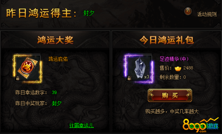 活动期间,购买限购礼包赢取幸运大奖,奖励极品限时称号。(全服限量买到即赚到)购买礼包越多,中奖几率越大!