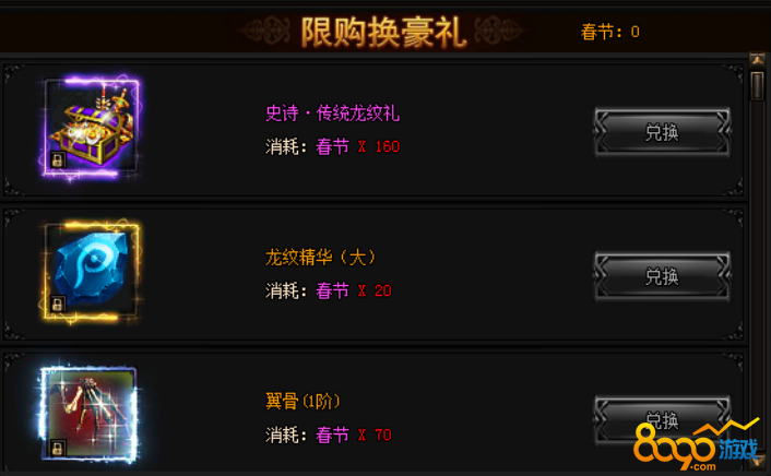 活动期间内,进行幸运探宝有一定概率获得春节。可以使用春节兑换下列极品奖励!