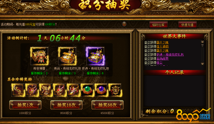 活动期间内,每充值100元宝可获得1积分!(温馨提示:活动结束前记得花完积分哦)