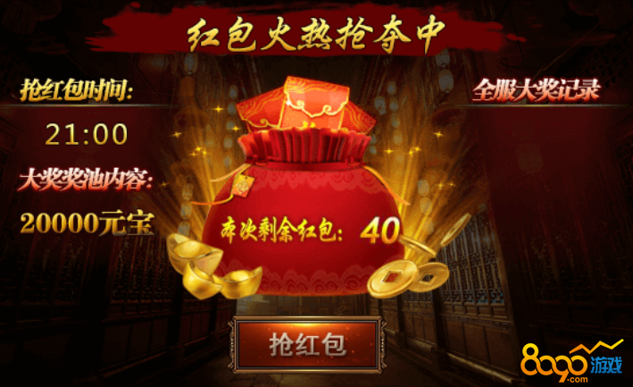 活动期间内,每天21点可抢新春红包!每人可抢10个红包,红包抢我全服必出一个大奖!