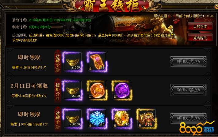 活动期间内,每充值8888元宝即可获得1份股份,最高持有100股份。达到指定要求股份数量和时间要求即可领取奖励!