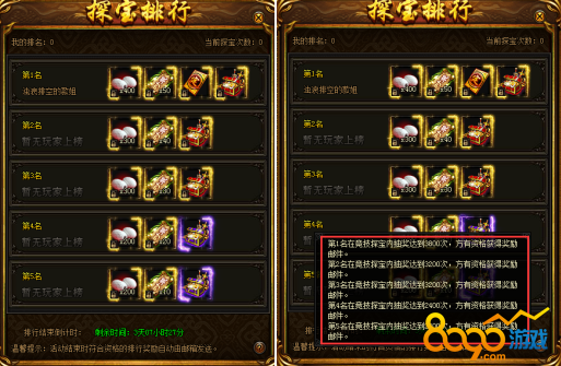 活动开启期间,累计探宝达到次数要求可获得排行奖励,第1/2/3/4/5名可获得排行奖励。