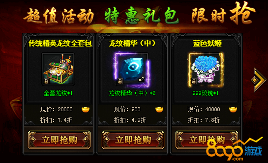 活动期间,可购买超优折扣每日限购礼包,传统精英龙纹全套包、蓝色妖姬、传承之力、印记灵魄、探宝符、羽毛、魂玉结晶、护盾结晶、暗器结晶、成就令牌、声望令牌等极品道具仅限活动期间跳楼优惠!