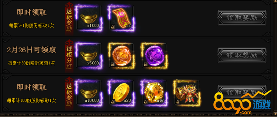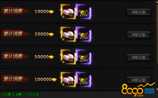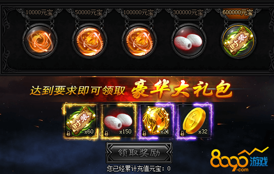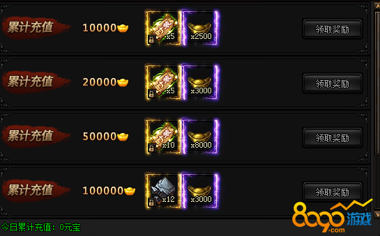 活动期间,每日累计充值指定数额元宝即可领取奖励!