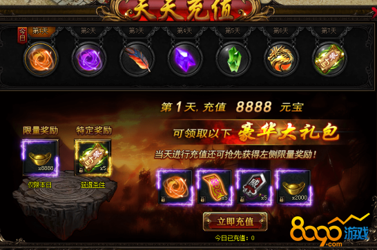 活动期间,每日累计充值指定数额元宝即可领取奖励!