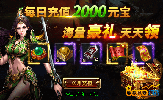 活动期间内,每天充值2000元宝可以领取1000W经验,高级属强丹,成就令牌,探宝符、8小时三倍经验符等海量道具!