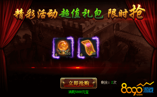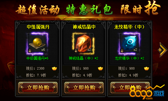 活动期间,可购买超优折扣每日限购礼包,神戒结晶、中级属强丹、传承之力、龙纹精华、印记灵魄、探宝符、羽毛、魂玉结晶、护盾结晶、暗器结晶、成就令牌、声望令牌等极品道具仅限活动期间跳楼优惠!