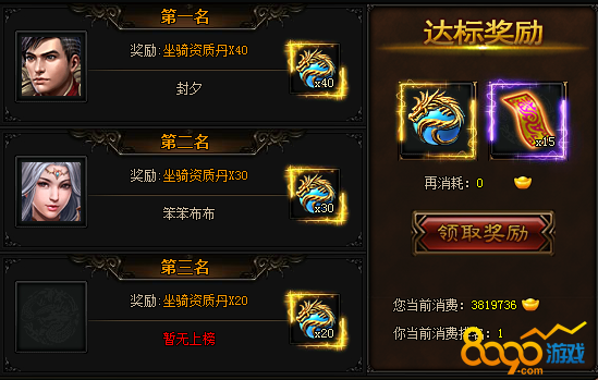 活动期间,活动期间,累计消费20000元宝可获得达标奖励,消费第1,2,3名可获得排行奖励(至少消费60万元宝!)