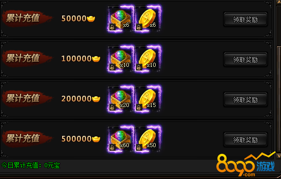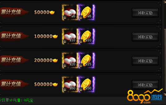 活动期间内,玩家累计充值元宝数额即可领取奖励。