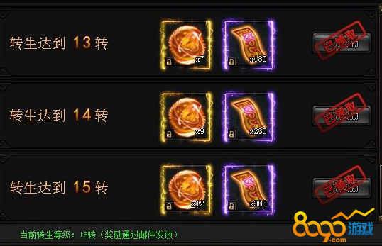 活动期间,转生达到指定要求即可领取大奖!每项奖励每人仅限领取一次!