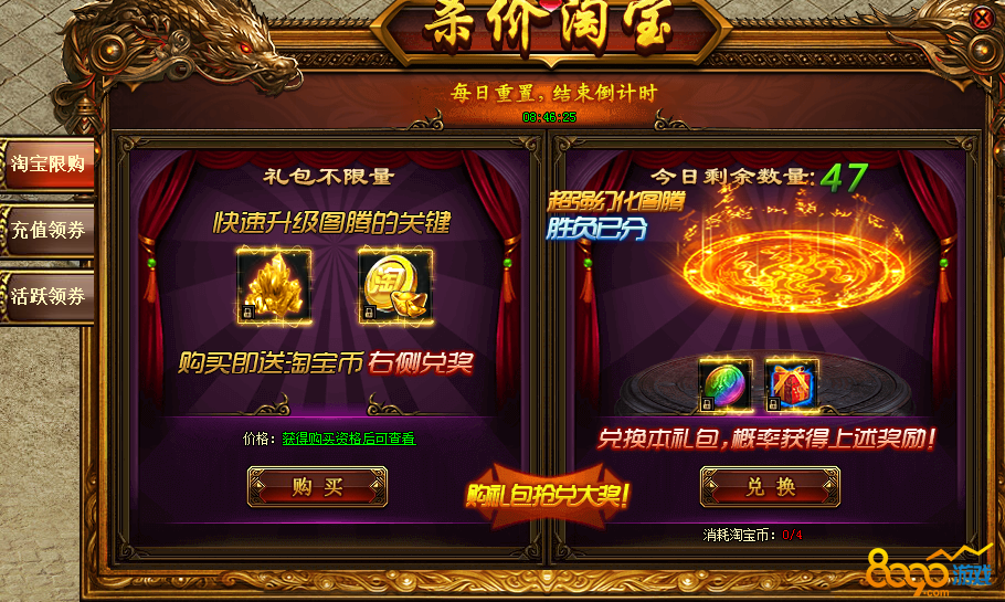 活动期间,每人每天可购买超值优惠的探宝符、兑换硬币!(温馨提示:7月7日到7月14日0点期间,不同时间会出不同的限购道具哦)
