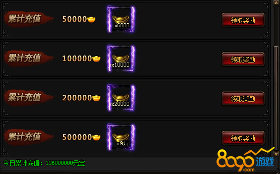 活动期间,每日累计充值指定数额元宝即可领取奖励!