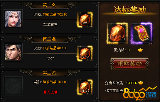 活动开启期间,累计消费20000元宝可获得达标奖励,消费第1/2/3名可获得排行奖励(至少消费60万元宝)
