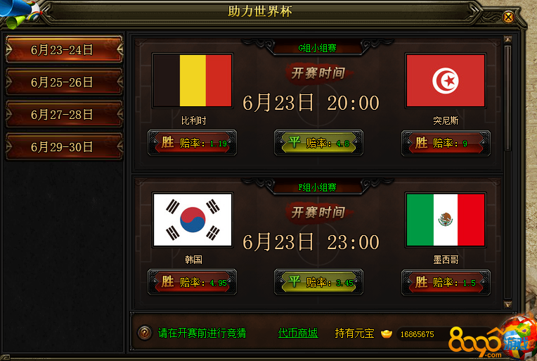 活动期间,每场比赛开始前可以选择支持某个球队进行下注,单场比赛下注上限10万元宝;比赛下注后统一次日上午结算,通过邮件发放奖励;成功压中比赛结果返还对应数量元宝同时按(赔率-1)的倍率返还猜猜乐代币,失败则无返还。代币可用于购买世界杯专属称号以及专属时装。
