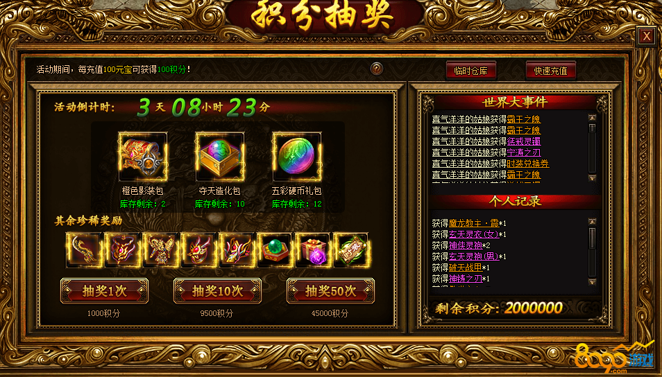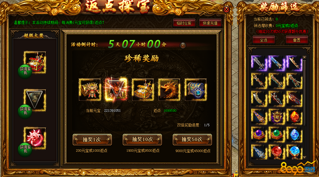 活动期间,每充值5000元宝获得一次免费抽奖机会!