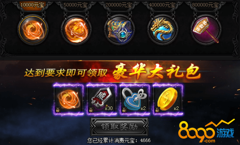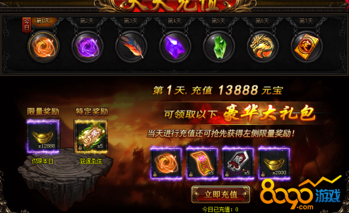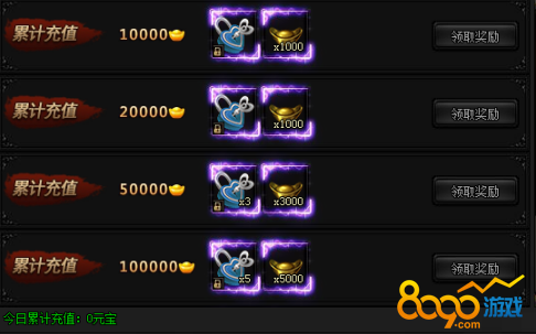 活动期间,每日累计充值指定数额元宝即可领取奖励!
