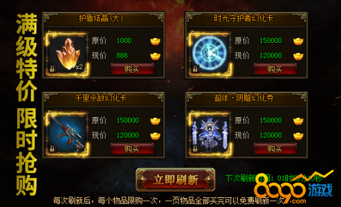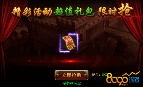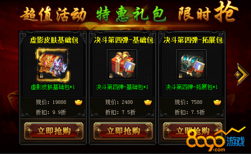 活动期间,可购买超优折扣每日限购礼包,神戒结晶、中级属强丹、传承之力、龙纹精华、印记灵魄、探宝符、羽毛、魂玉结晶、护盾结晶、暗器结晶、成就令牌、声望令牌等极品道具仅限活动期间跳楼优惠!