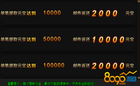 活动期间内,每日单笔充值指定数额元宝即可领取奖励!
