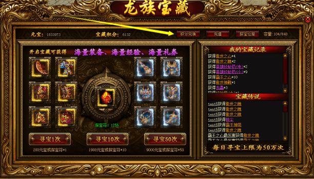 1.开放积分探宝活动,充值可以领取积分进行探宝,探宝可以获得大量超稀有装备和材料