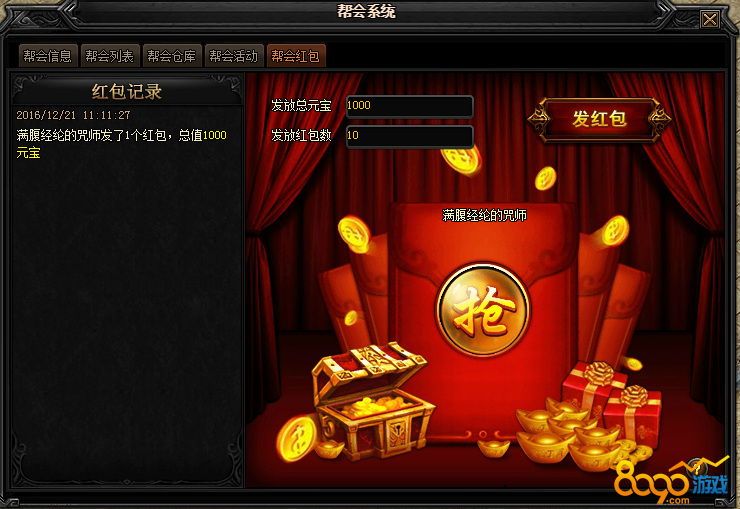 千金散尽还复来,谁说兄弟不能谈金钱?帮会成员可以在帮会面板的帮会红包页面发红包或抢红包,活跃帮会气氛。