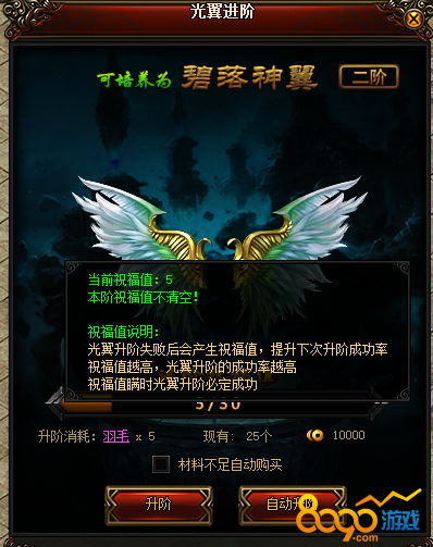 2>光翼升阶失败会产生祝福值,提升成功率,当祝福值达到满值时,下次升阶必定成功