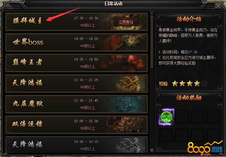 玩家每天在比奇城膜拜城主可以获得大量经验,升级安全快捷。