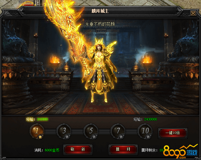 消耗金币可刷新膜拜经验倍数,每次刷新倍数随机,也可消耗元宝进行一键10倍奖励。
